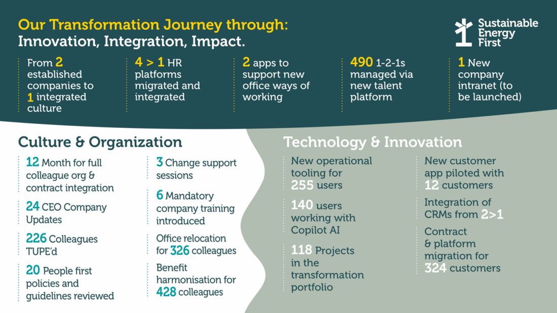 We’re really proud of our transformation over the last few years, especially as this was guided by our bold vision: to become the UK’s most trusted sustainability consultancy by uniting our people, platforms, and purpose. We established a structured programme to integrate Sustainable Energy First and Inenco into a single, high-performing organisation, one that could deliver on our mission to decarbonise UK business at scale.